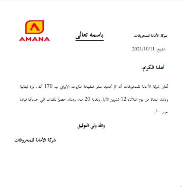 حدّدت شركة «الأمانة للمحروقات»، اليوم، تسعيرة جديدة لبيع صفيحة المازوت الإيراني ابتداءً من 12 تشرين الأول حتى العشرين منه بـ 170 ألف ليرة لبنانية، ارتفاعاً من 150 ألف ليرة