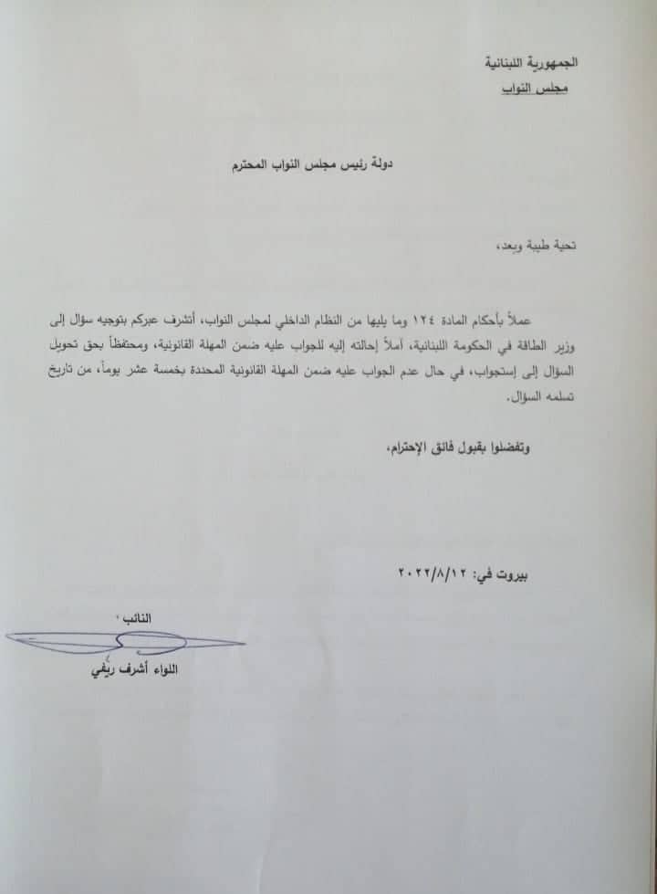 وطلب ريفي وفق بيان عن مكتبه الاعلامي ” الإجابة من وزير الطاقة خلال الفترة القانونية لتوجيه السؤال، حتى لا يتحول الى استجواب”