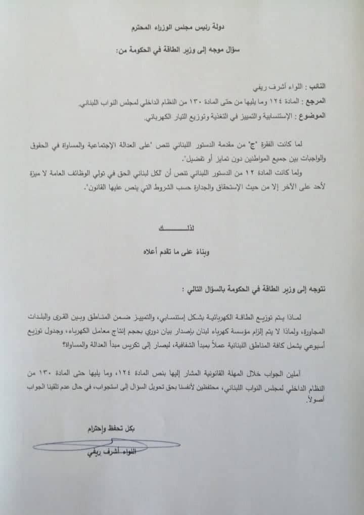 تقدم النائب اللواء أشرف ريفي بسؤال الى وزير الطاقة في حكومة تصريف الاعمال وليد فياض، حول” إستنسابية توزيع الطاقة التي تنتجها مؤسسة كهرباء لبنان ، وعدم العدالة والمساواة في التعامل مع المناطق”.